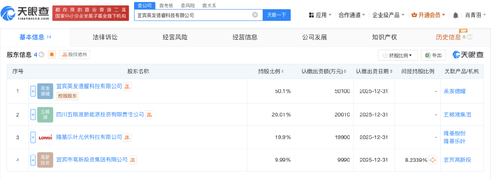 據(jù)天眼查顯示,該公司有四大股東,分別是宜賓英發(fā)德耀科技有限公司、四川五糧液新能源投資有限責(zé)任公司、隆基樂葉光伏科技有限公司以及地方國企宜賓市高新投資集團有限公司。