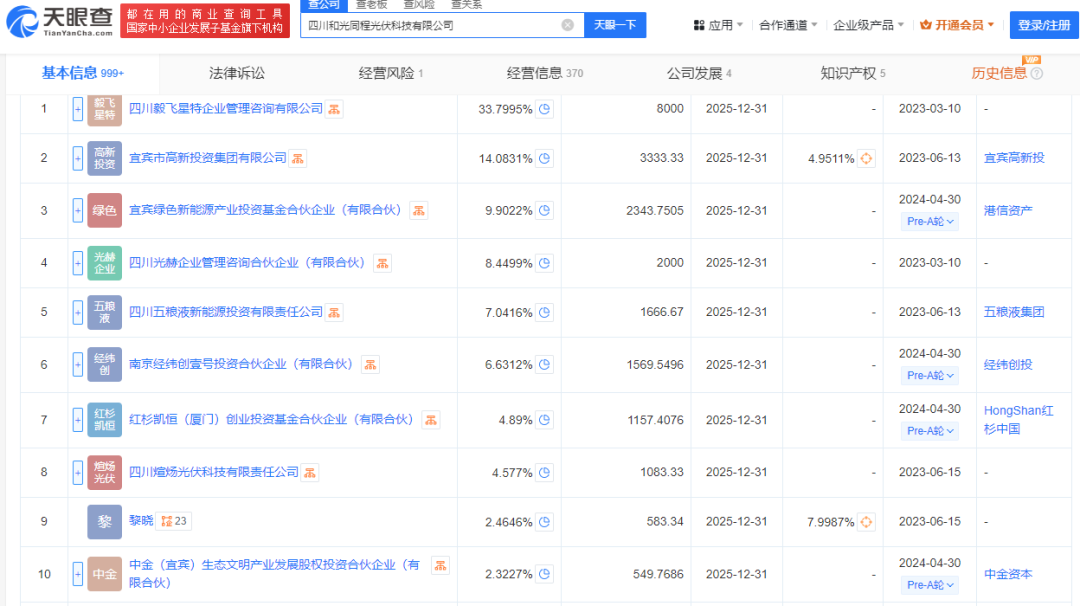 資料顯示,和光同程成立于2023年,是一家位于四川宜賓的光伏行業(yè)電池研發(fā)制造商,主營電池制造、太陽能發(fā)電技術(shù)服務(wù)、光伏設(shè)備及元器件制造等。其第一大股東四川毅飛星特企業(yè)管理咨詢有限公司的唯一股東是謝毅,與此同時,謝毅還持有四川光赫企業(yè)管理咨詢合伙企業(yè)(有限合伙)27.5%的股份。謝毅出生于1984年,曾任通威集團總裁助理、通威太陽能(合肥)有限公司董事長、通威太陽能(成都)有限公司董事長等。