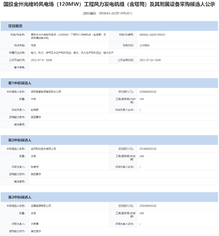 7月1日,國(guó)投全州光緒嶺風(fēng)電場(chǎng)(120MW)工程風(fēng)力發(fā)電機(jī)組(含塔筒)及其附屬設(shè)備采購(gòu)候選人公示,明陽(yáng)智能預(yù)中標(biāo),投標(biāo)報(bào)價(jià)25884萬(wàn)元。