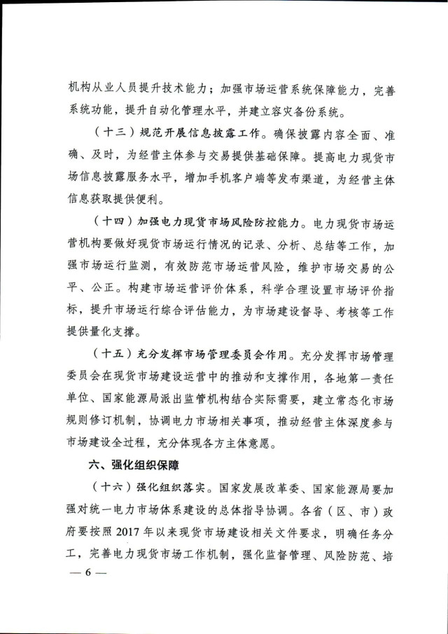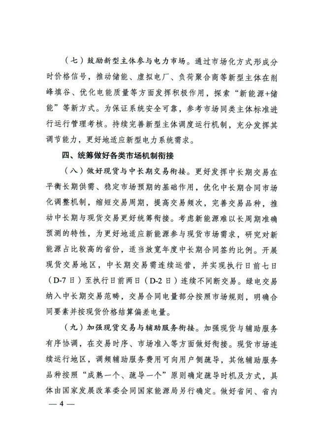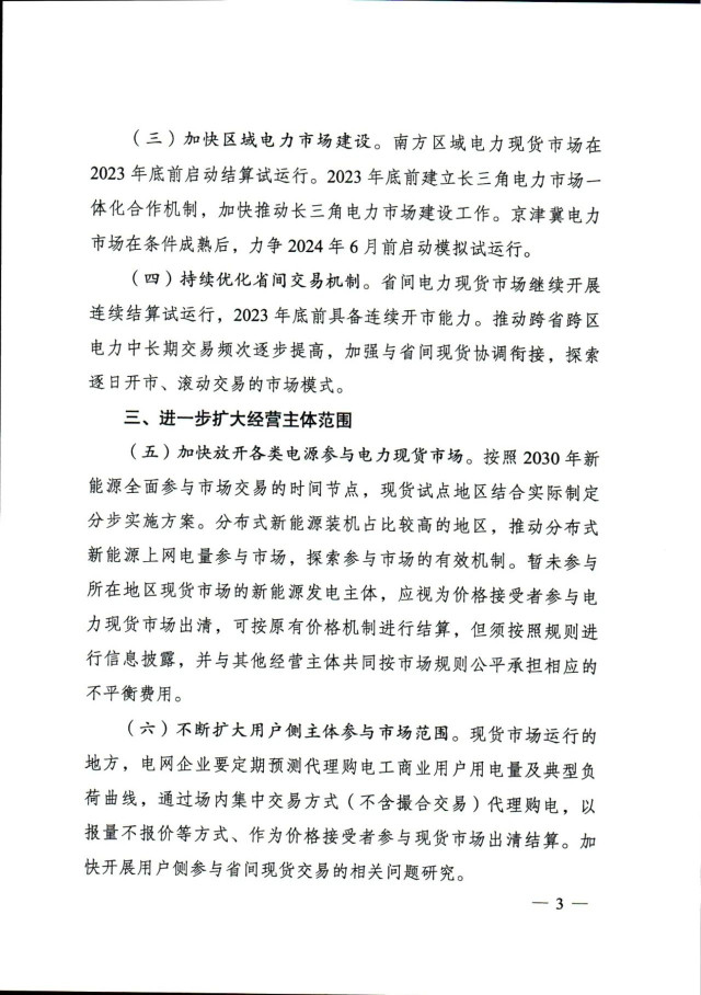 通知提出,加快放開各類電源參與電力現(xiàn)貨市場。按照2030年新能源全面參與市場交易的時間節(jié)點,現(xiàn)貨試點地區(qū)結(jié)合實際制定分步實施方案。分布式新能源裝機(jī)占比較高的地區(qū),推動分布式新能源上網(wǎng)電量參與市場,探索參與市場的有效機(jī)制。暫未參與所在地區(qū)現(xiàn)貨市場的新能源發(fā)電主體,應(yīng)視為價格接受者參與電力現(xiàn)貨市場出清,可按原有價格機(jī)制進(jìn)行結(jié)算,但須按照規(guī)則進(jìn)行信息披露,并與其他經(jīng)營主體共同按市場規(guī)則公平承擔(dān)相應(yīng)的不平衡費(fèi)用。