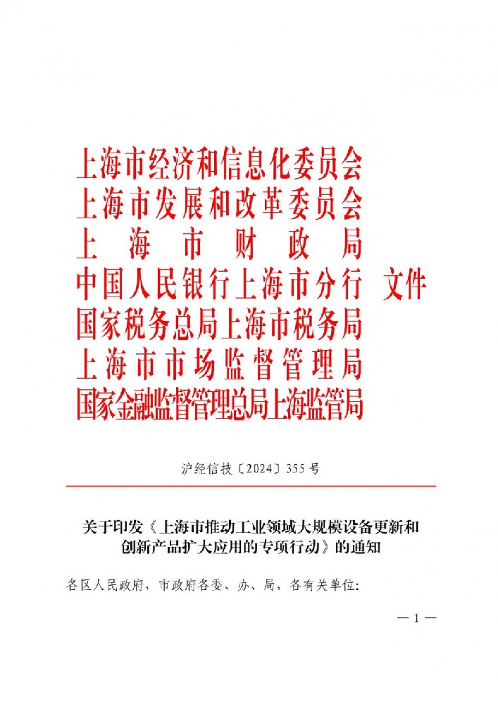5月31日,上海市經(jīng)濟(jì)和信息化委員會(huì)等七部門(mén)印發(fā)《上海市推動(dòng)工業(yè)領(lǐng)域大規(guī)模設(shè)備更新和創(chuàng)新產(chǎn)品擴(kuò)大應(yīng)用的專項(xiàng)行動(dòng)》。
