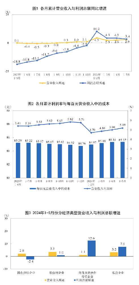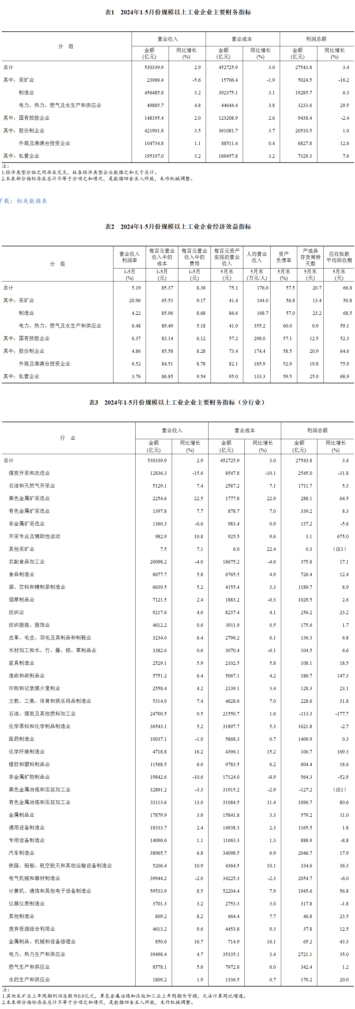 1—5月份,規(guī)模以上工業(yè)企業(yè)實現(xiàn)營業(yè)收入53.03萬億元,同比增長2.9%;發(fā)生營業(yè)成本45.27萬億元,增長3.0%;營業(yè)收入利潤率為5.19%,同比提高0.02個百分點。