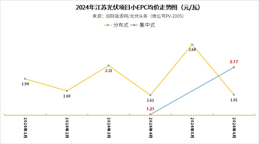 集中式小EPC,僅4月與6月有項(xiàng)目定標(biāo),均價分別為1.21元/W與2.17元/W。