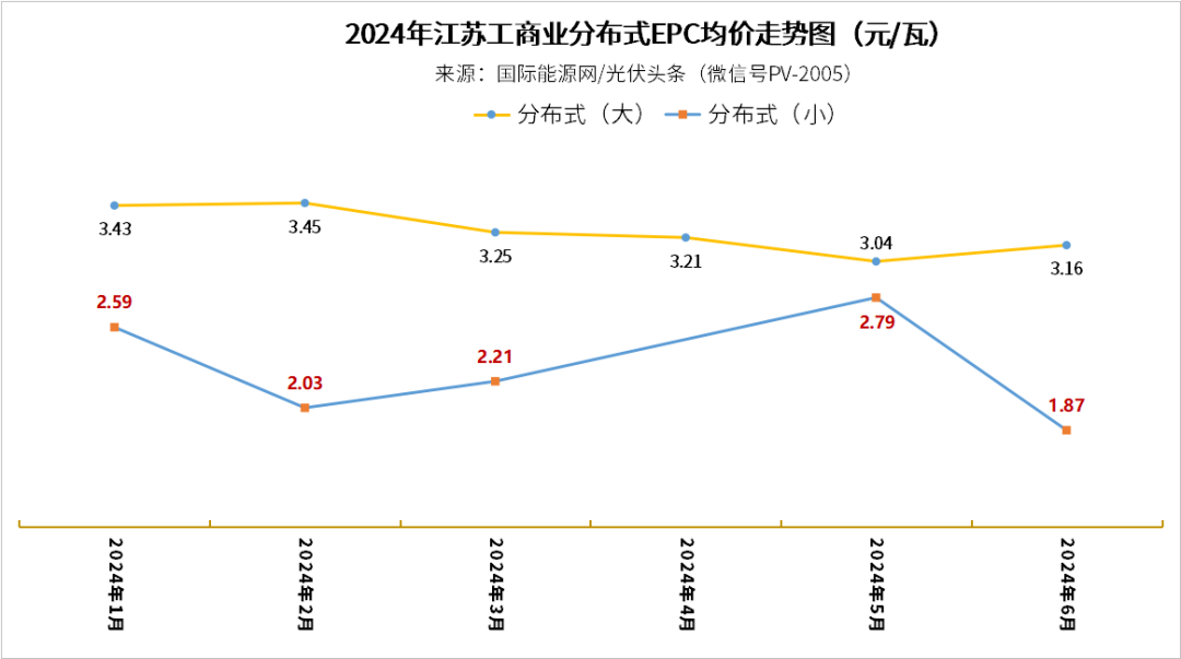 今年一季度,江蘇工商業(yè)新增裝機(jī)2.416GW,超越浙江成為工商業(yè)第一裝機(jī)大省。江蘇工商業(yè)分布式EPC價格具有指標(biāo)性意義。從價格走勢來看,1月,工商業(yè)光伏大EPC均價3.43元/W,2月達(dá)到上半年最高點(diǎn)3.45元/W。5月下探至最低點(diǎn),均價為3.04元/W。