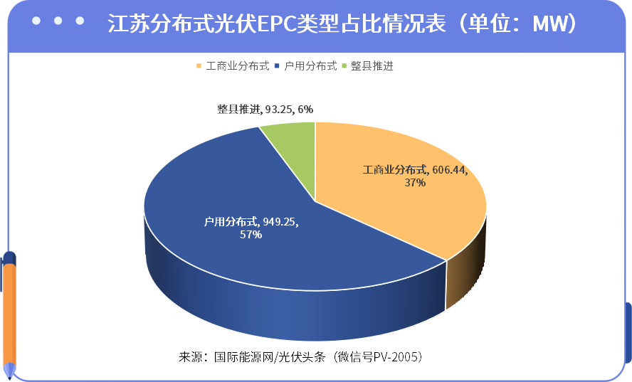 具體分布式EPC方面,工商業(yè)分布式合計容量606.44MW,占比達(dá)到37%;整縣推進(jìn)集中開發(fā)項(xiàng)目合計容量93.25MW,占比6%;戶用分布式占比最高達(dá)57%。