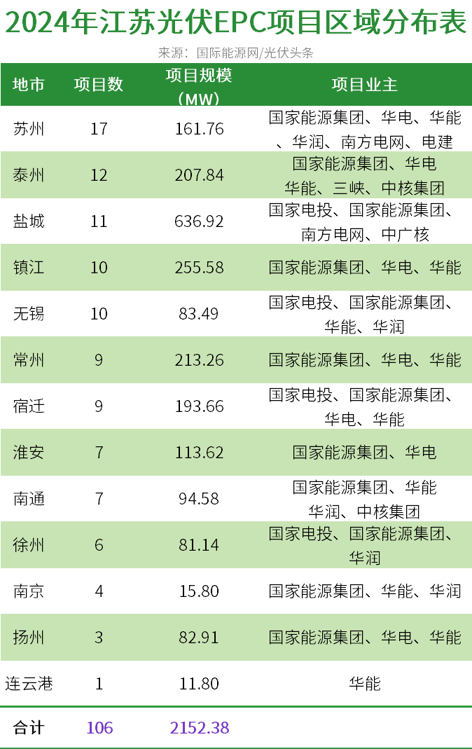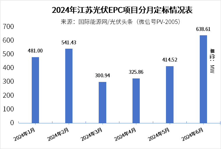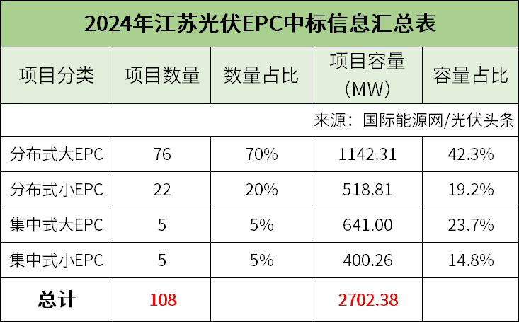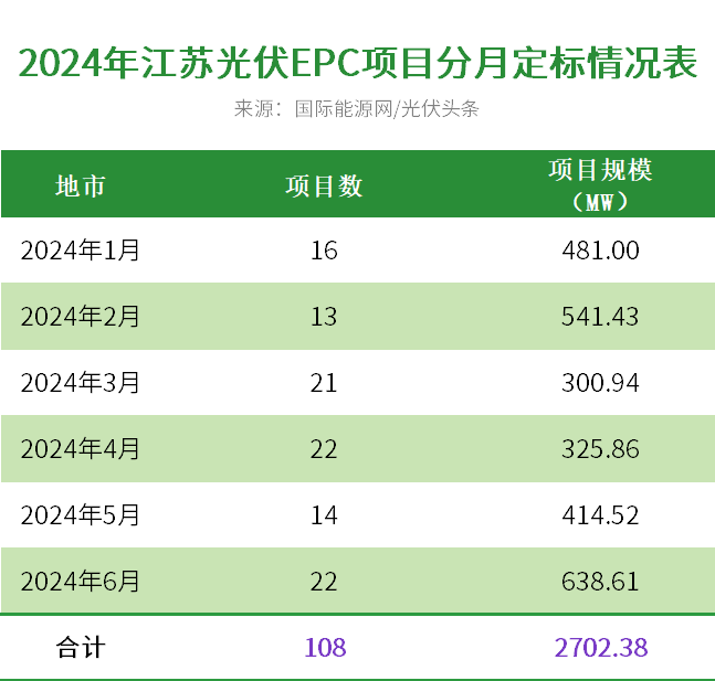 國際能源網(wǎng)/光伏頭條(PV-2005)統(tǒng)計,2024年上半年,江蘇有108個光伏EPC項(xiàng)目定標(biāo),合計容量2702.38MW。