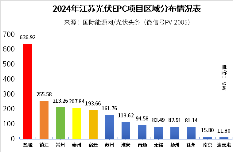 從地市分布情況來看,鹽城以636.92MW高居榜首,鎮(zhèn)江以255.58MW排名第二,常州以213.26排名第三。