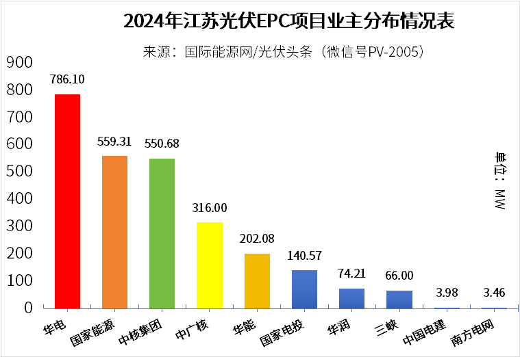 國際能源網(wǎng)/光伏頭條(PV-2005)統(tǒng)計今年上半年,江蘇光伏EPC開發(fā)業(yè)主方面,華電集團(tuán)以786.1MW排名第一,國家能源集團(tuán)以559.31MW列第二,中核集團(tuán)則以550.68MW位居第三。