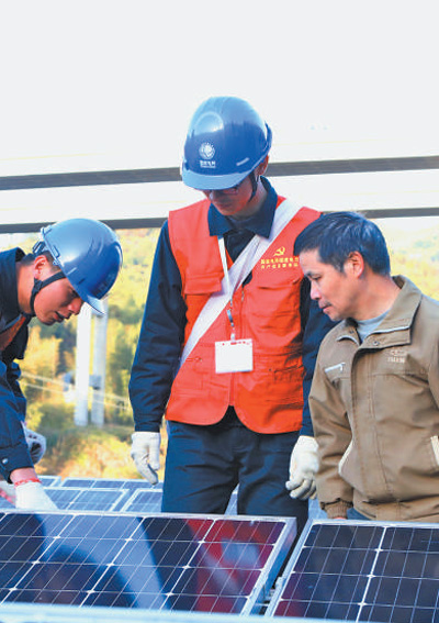 國(guó)網(wǎng)福建省電力公司員工幫助用戶檢查光伏發(fā)電板。