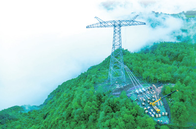 國(guó)家電網(wǎng)白鶴灘至浙江±800千伏特高壓輸電工程四川段放線現(xiàn)場(chǎng)。