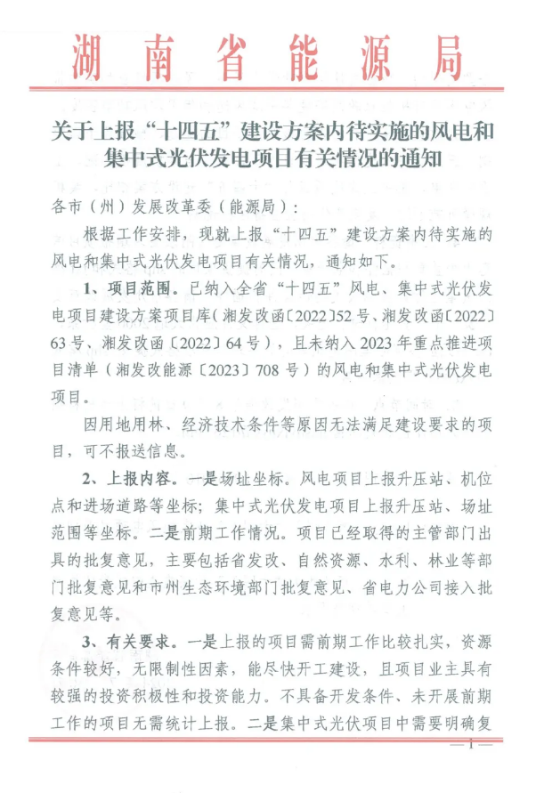 7月30日,湖南省能源局下發(fā)《關(guān)于上報“十四五”建設(shè)方案內(nèi)待實施的風(fēng)電和集中式光伏發(fā)電項目有關(guān)情況的通知》。