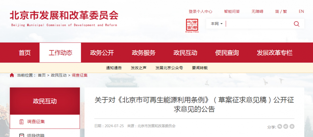 2024年7月25日,北京市發(fā)展和改革委員會發(fā)布關(guān)于對《北京市可再生能源利用條例》(草案征求意見稿)公開征求意見的公告。