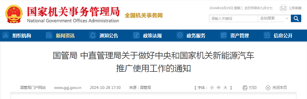 10月28日,國管局、中直管理局聯(lián)合印發(fā)《關(guān)于做好中央和國家機(jī)關(guān)新能源汽車推廣使用工作的通知》,旨在支持新能源汽車產(chǎn)業(yè)發(fā)展,更好發(fā)揮中央和國家機(jī)關(guān)示范引領(lǐng)作用。