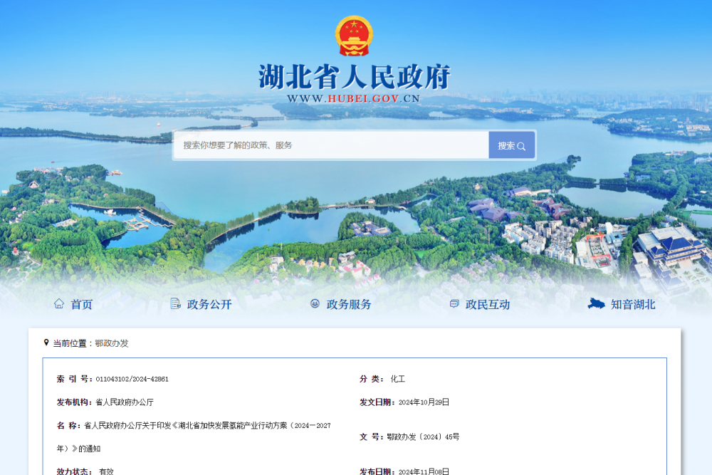 11月8日,湖北省人民政府辦公廳關(guān)于印發(fā)《湖北省加快發(fā)展氫能產(chǎn)業(yè)行動方案(2024—2027年)》的通知。