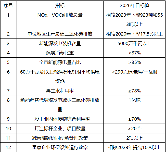 2026年,減污降碳協(xié)同能力顯著提升,建立以重點企業(yè)信息臺賬為基礎(chǔ)的污染物和碳排放協(xié)同管理機制,重點領(lǐng)域形成減污降碳協(xié)同技術(shù)清單和一批典型案例,減污降碳協(xié)同度有效提升,充分體現(xiàn)減污降碳協(xié)同創(chuàng)新對綠色低碳轉(zhuǎn)型發(fā)展的促進作用。打造10個以上減污降碳協(xié)同增效標桿企業(yè)或標桿項目,新能源發(fā)電裝機容量達到5000萬千瓦以上,重點企業(yè)環(huán)保設(shè)施運行效率相較2023年提高10%以上,當年全市NOx、VOCs排放總量分別下降423噸、253噸以上,單位地區(qū)生產(chǎn)總值二氧化碳排放相較2020年下降17.5%以上。