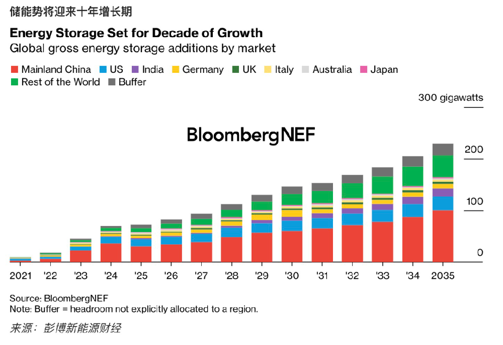 全球新增儲能裝機(jī)容量在2024年創(chuàng)下紀(jì)錄,隨后直至2035年將以17.0%的年復(fù)合增長率增長,2035年年新增裝機(jī)容量達(dá)227GW/955GWh 。相比之下,全球風(fēng)電和光伏市場同期的年復(fù)合增長率分別為7.0%和7.5%。