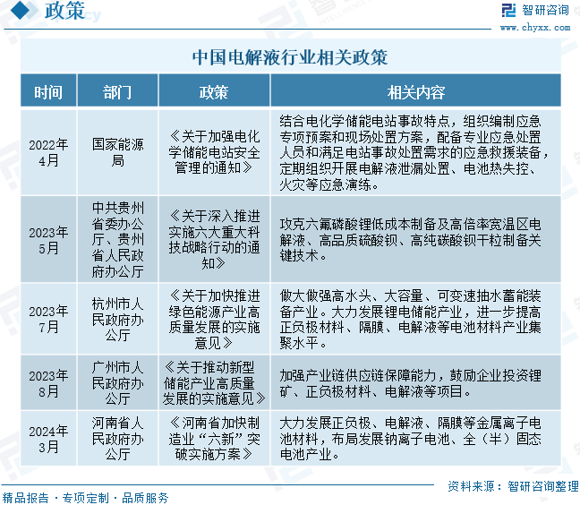 近年來(lái),中國(guó)加快出臺(tái)電解液行業(yè)相關(guān)政策,以推動(dòng)電解液行業(yè)的健康發(fā)展。2022年4月,國(guó)家能源局印發(fā)《關(guān)于加強(qiáng)電化學(xué)儲(chǔ)能電站安全管理的通知》,提出要結(jié)合電化學(xué)儲(chǔ)能電站事故特點(diǎn),組織編制應(yīng)急專(zhuān)項(xiàng)預(yù)案和現(xiàn)場(chǎng)處置方案,配備專(zhuān)業(yè)應(yīng)急處置人員和滿(mǎn)足電站事故處置需求的應(yīng)急救援裝備,定期組織開(kāi)展電解液泄漏處置、電池?zé)崾Э亍⒒馂?zāi)等應(yīng)急演練。2024年3月,河南省人民政府辦公廳印發(fā)《河南省加快制造業(yè)“六新”突破實(shí)施方案》,提出要大力發(fā)展正負(fù)極、電解液、隔膜等金屬離子電池材料,布局發(fā)展鈉離子電池、全(半)固態(tài)電池產(chǎn)業(yè)。