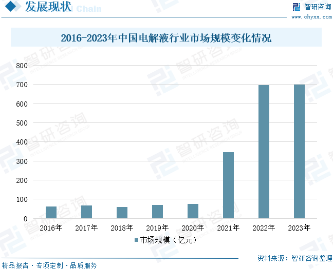 近年來(lái),隨著全球及國(guó)內(nèi)新能源汽車(chē)和鋰電池行業(yè)快速發(fā)展,國(guó)內(nèi)在電解液材料方面已具備一定的產(chǎn)能和技術(shù)優(yōu)勢(shì),也使得我國(guó)電解液市場(chǎng)規(guī)模不斷增長(zhǎng);尤其是2021年得到迅速發(fā)展。數(shù)據(jù)顯示,2021年,我國(guó)電解液市場(chǎng)規(guī)模迅速增長(zhǎng),約為346.53億元,同比上升355%。2023年我國(guó)電解液市場(chǎng)規(guī)模約為700億元。