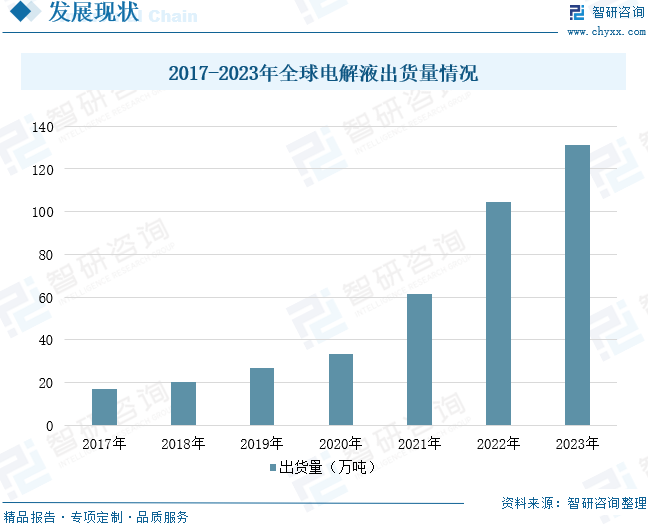 通常電解液占電池重量和體積的比重分別為15%、32%,其對(duì)純度及雜質(zhì)的含量要求非常高,生產(chǎn)過(guò)程中需要高純的原料以及必要的提純工藝。2017年至2022年全球電解液出貨量由16.7萬(wàn)噸增長(zhǎng)至104.3萬(wàn)噸,2023年全球電解液出貨量約為131.26萬(wàn)噸。
