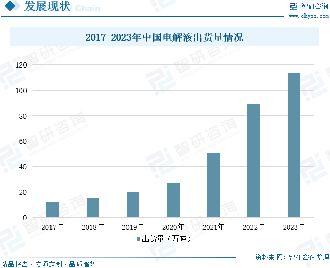 我國(guó)電解液產(chǎn)量不斷增加,近年來(lái)隨著鋰電池產(chǎn)業(yè)的成熟,國(guó)產(chǎn)鋰電池電解液從2002年左右開(kāi)始進(jìn)入市場(chǎng),并逐步取代進(jìn)口產(chǎn)品。2022年中國(guó)電解液出貨量為89.1萬(wàn)噸,同比增長(zhǎng)75.70%。2023年中國(guó)電解液出貨量為113.8萬(wàn)噸,同比增長(zhǎng)27.7%,中國(guó)電解液出貨量的全球占比繼續(xù)提升至86.7%。