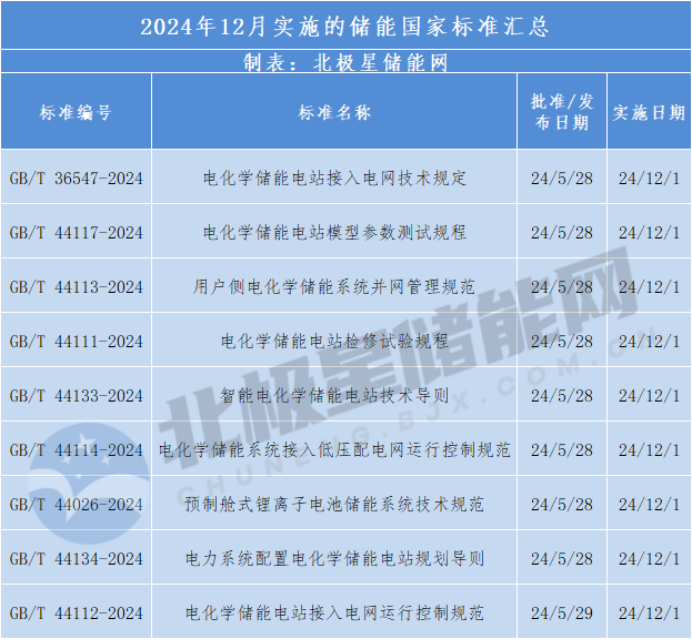 2024年12月起,將有9個(gè)國家級(jí)儲(chǔ)能標(biāo)準(zhǔn)開始實(shí)施,其中包括:電化學(xué)儲(chǔ)能電站接入電網(wǎng)運(yùn)行控制規(guī)范、鋰離子電池儲(chǔ)能系統(tǒng)安全評估規(guī)范、用戶側(cè)鋰離子電池儲(chǔ)能設(shè)備驗(yàn)收規(guī)范、預(yù)制艙式儲(chǔ)能電站設(shè)計(jì)規(guī)范等,為規(guī)范電站運(yùn)營、保障儲(chǔ)能安全提供重要支撐。