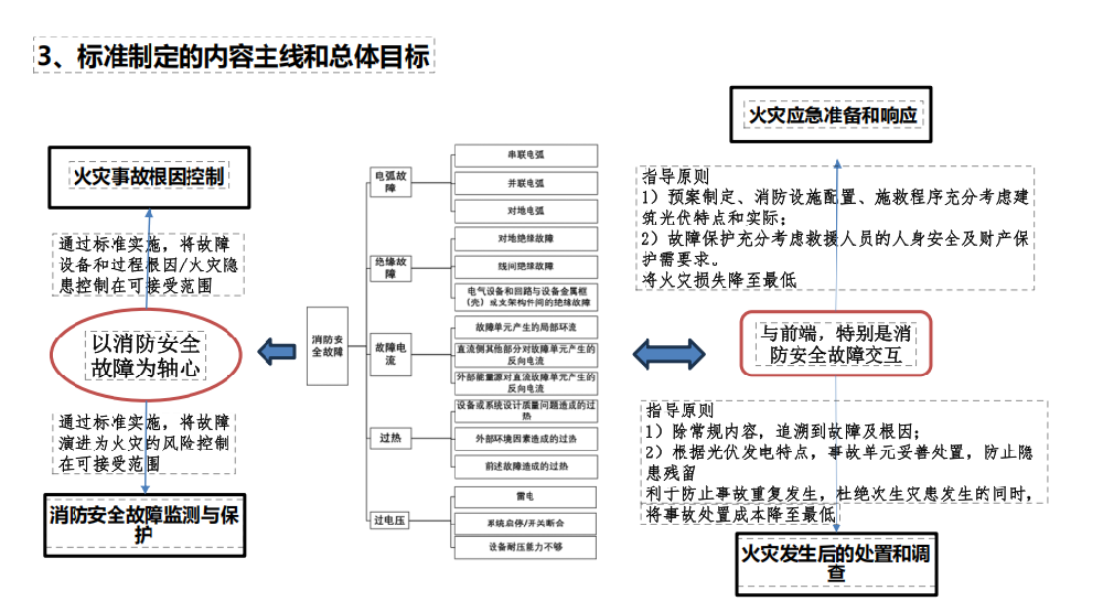 與現(xiàn)行光伏發(fā)電專用標準對比發(fā)現(xiàn),消防要求為通用消防標準的延伸,側(cè)重于材料防火性能、消防器材配置等方面要求,對事故根因、故障保護等方面要求不夠系統(tǒng)和完整。而《建筑光伏消防技術(shù)規(guī)范》各過程并重,補充、完善、突出根因控制和故障保護。