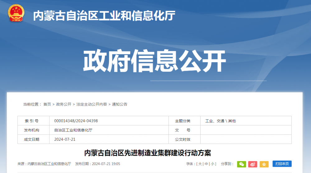 2024年7月21日,內(nèi)蒙古工信廳官網(wǎng)發(fā)布《內(nèi)蒙古自治區(qū)先進(jìn)制造業(yè)集群建設(shè)行動(dòng)方案》。